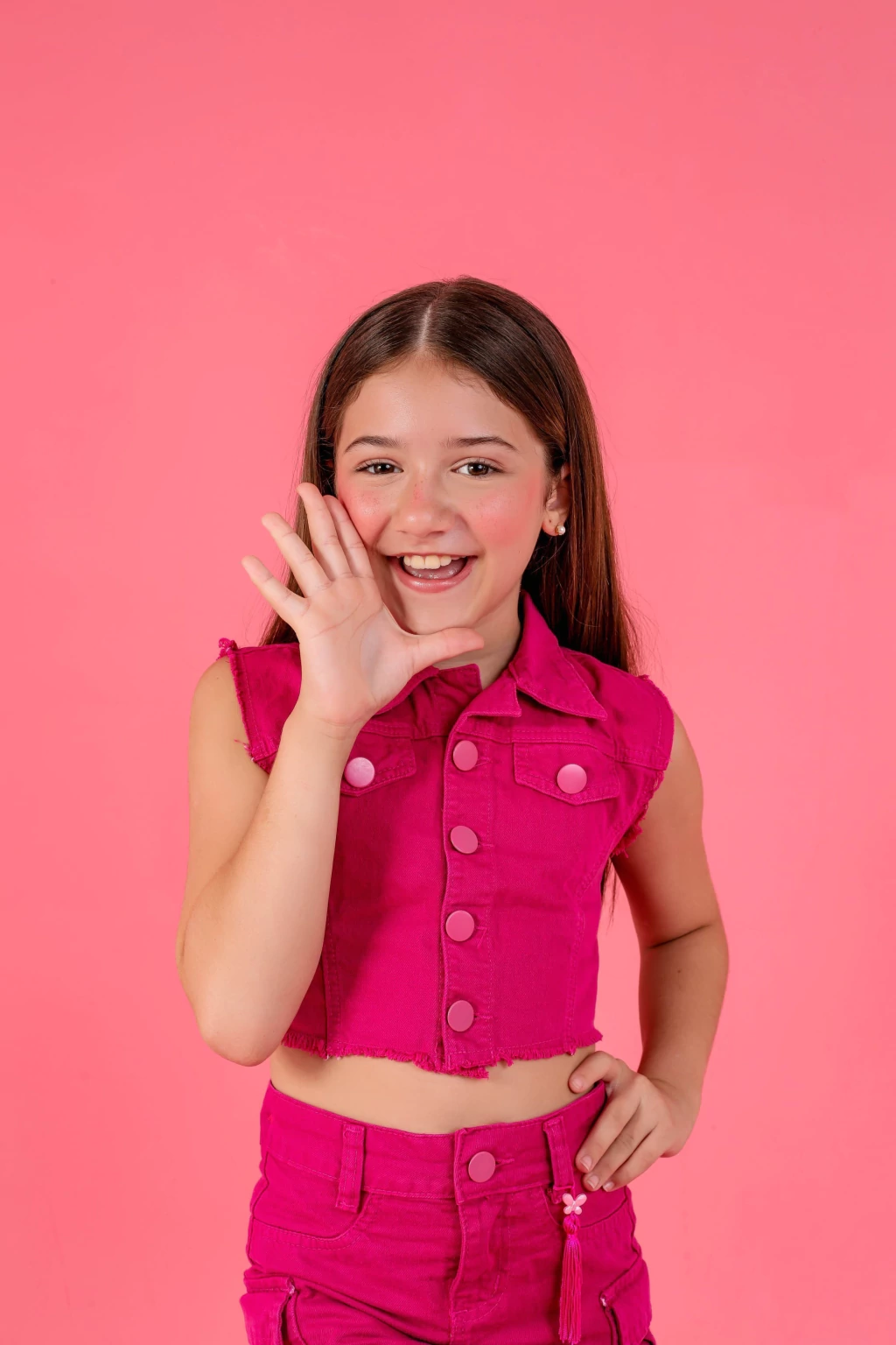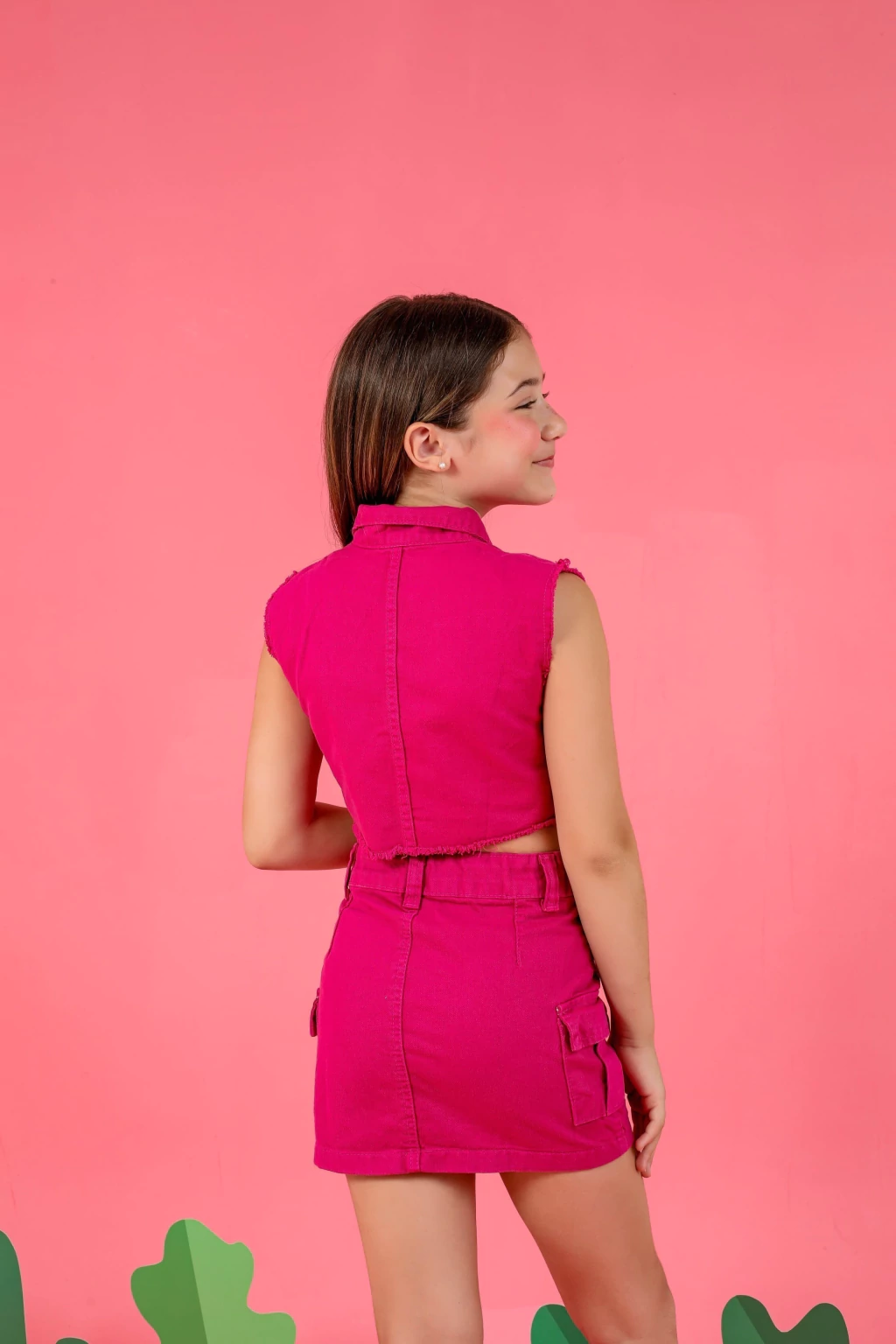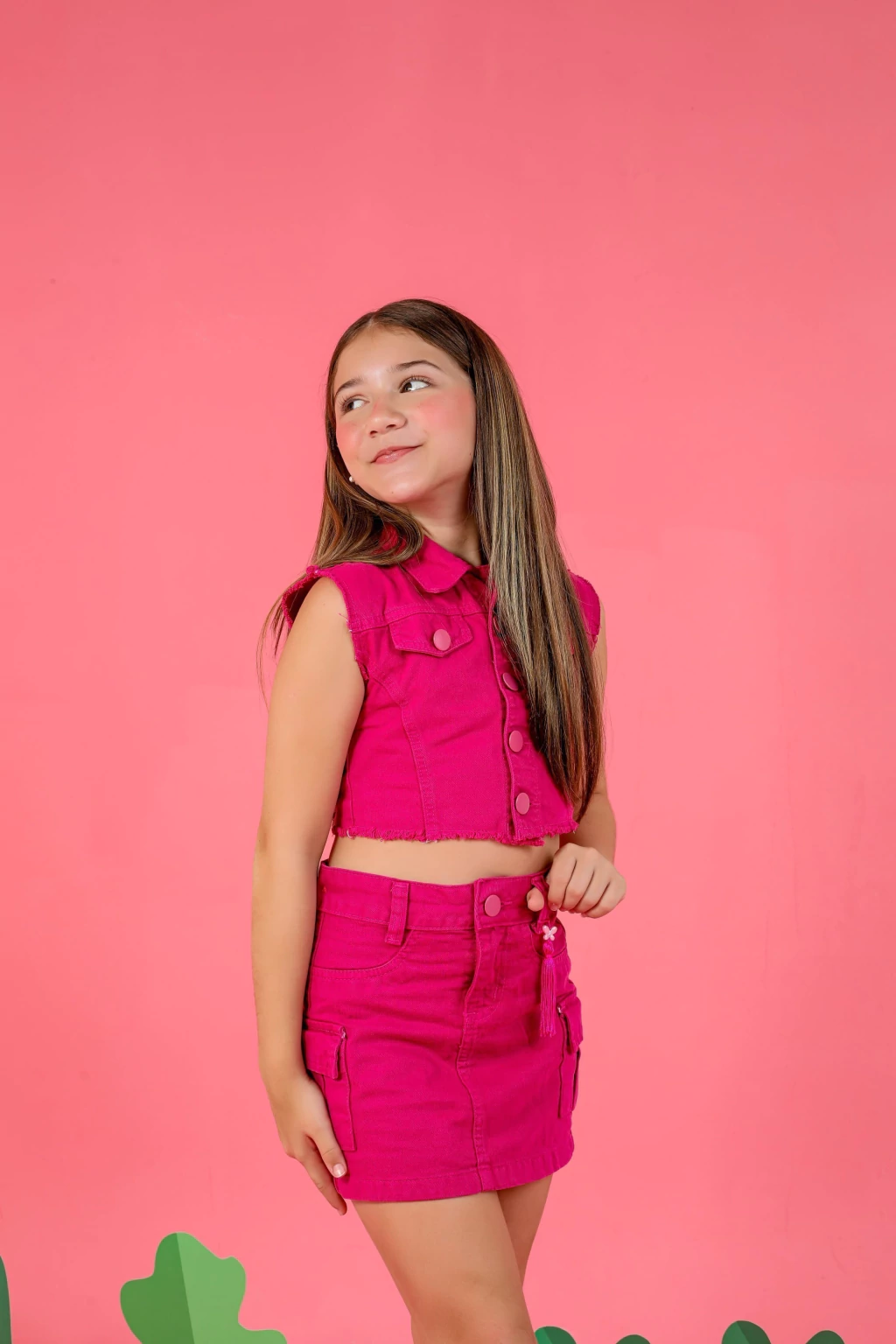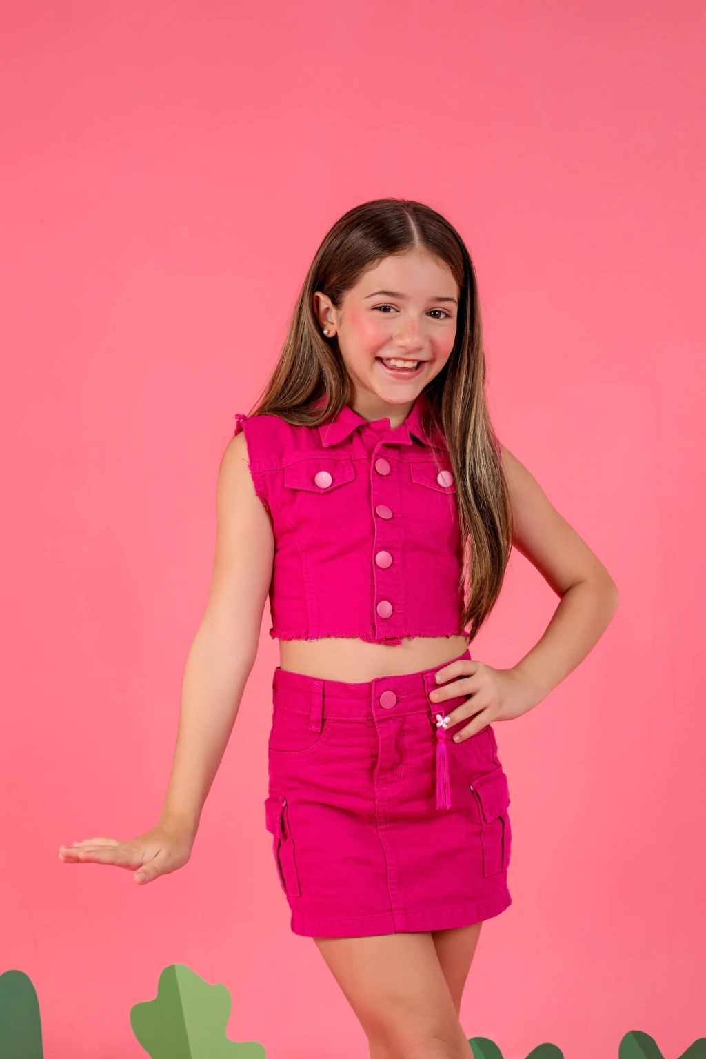 Deixe o estilo das pequenas brilhar com esse conjunto infantil composto por um colete cropped com botões frontais e acabamento desfiado nas mangas, e uma saia cargo com regulador no cois para maior conforto e praticidade. A saia conta com bolsos utilitários e um charm pendurado, trazendo um toque moderno e divertido ao look. Ideal para passeios, festas ou momentos especiais, esse conjunto une charme, conforto e muito estilo!