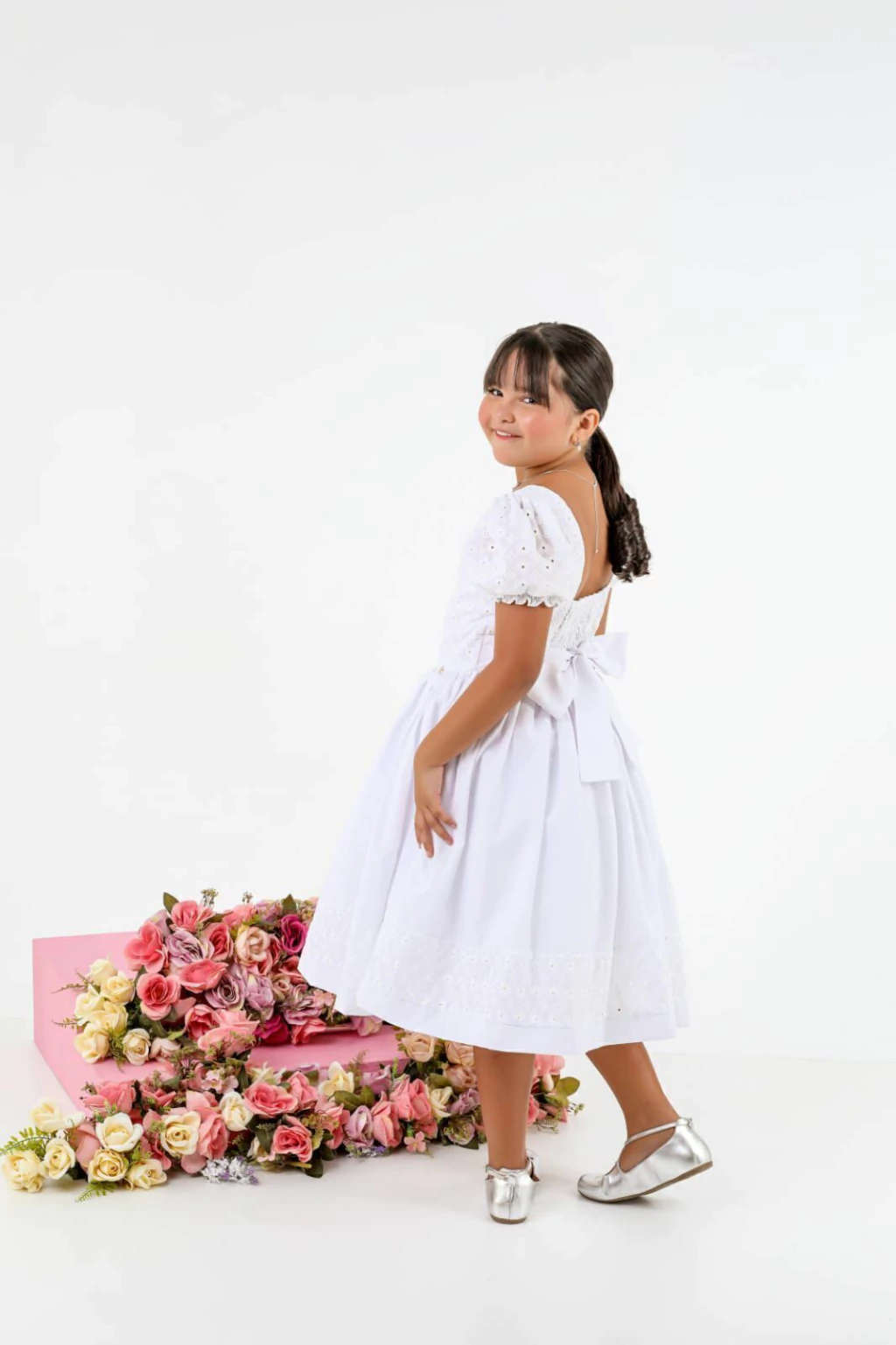 Confeccionado em tecido lese, ele possui mangas bufantes encantadoras, modelagem rodada e detalhes sutis que trazem um charme atemporal. Ideal para daminhas, batizados, festas e momentos especiais, proporcionando conforto e estilo para a sua pequena brilhar com muita graça e doçura.