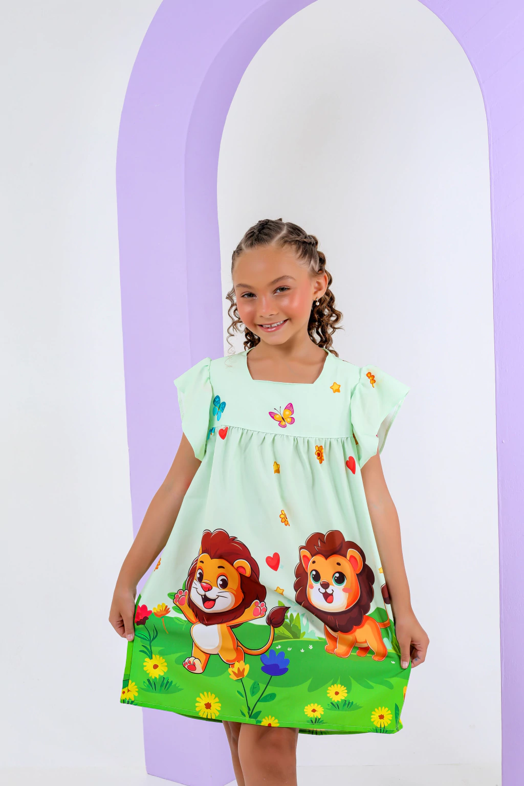 Encante-se com esse vestido infantil super delicado, perfeito para as pequenas que amam conforto e fofura! Com estampa alegre de leõezinhos sorridentes, ele traz um toque de magia e diversão ao look. Feito em tecido leve e fresquinho, tem modelagem soltinha, manguinhas com babadinhos e fechamento nas costas para mais praticidade. Ideal para passeios, festas e momentos especiais, deixando sua princesa ainda mais linda e feliz!